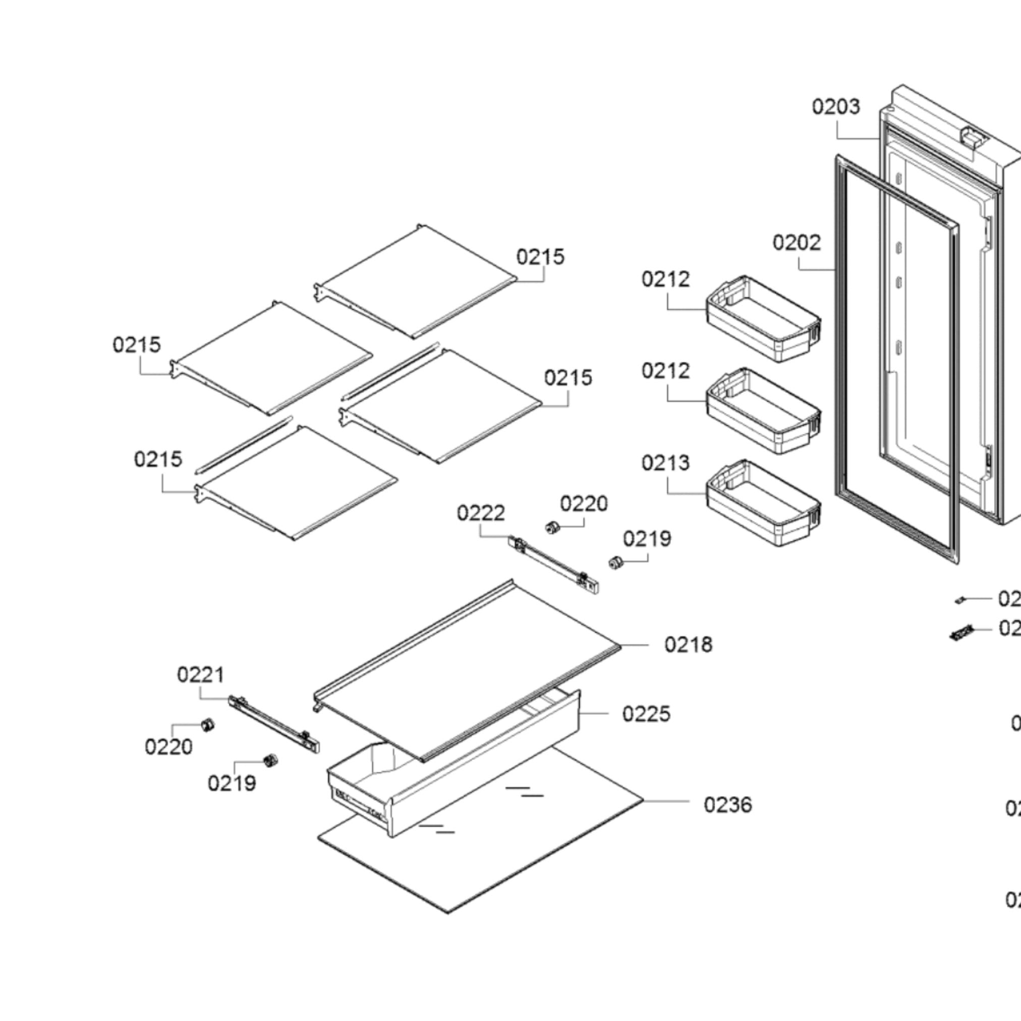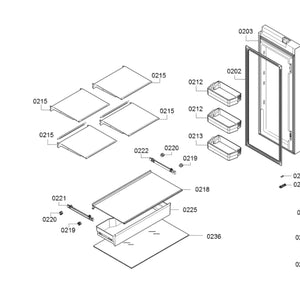 The Thermador T36FT820NS Refrigerator Glass Shelf Panel is a specially designed part that fits perfectly in compatible Thermador fridges. The shatterproof panel ensures safety and strength, making it perfect for any home. PART NO 215 ON IMAGE.